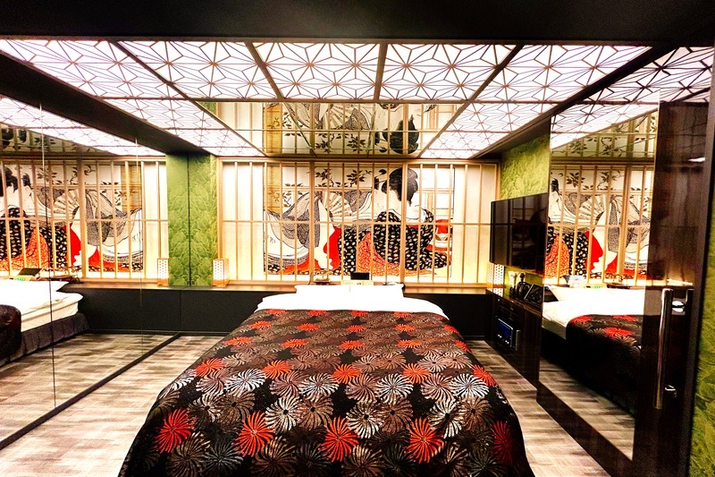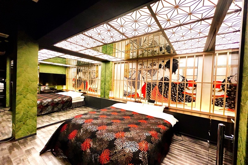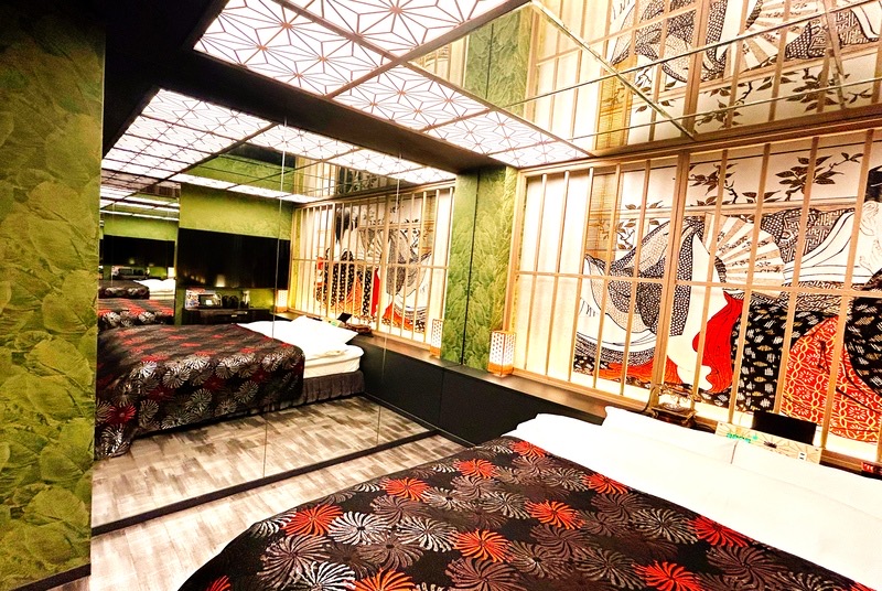 シックな和モダンルームです。デザインされたおしゃれな天井に中心は大きな鏡となっております。鏡も多く開放的な雰囲気のお部屋で非日常的な時間をお過ごし下さい。カラオケも設置しております。